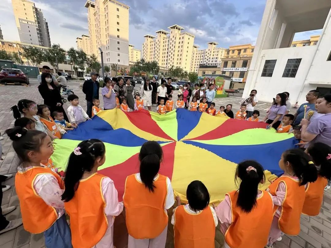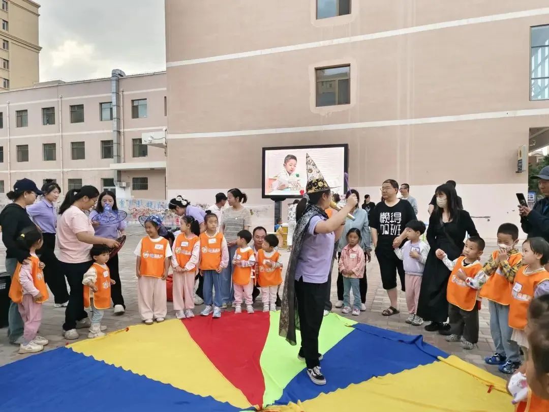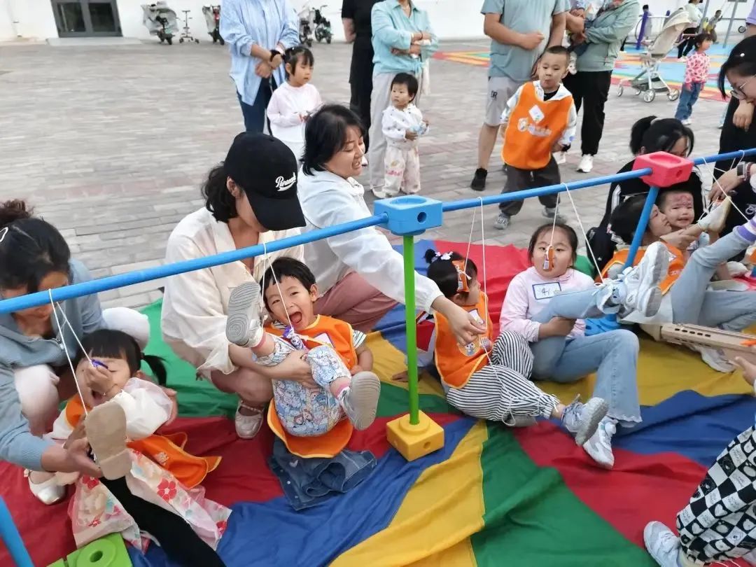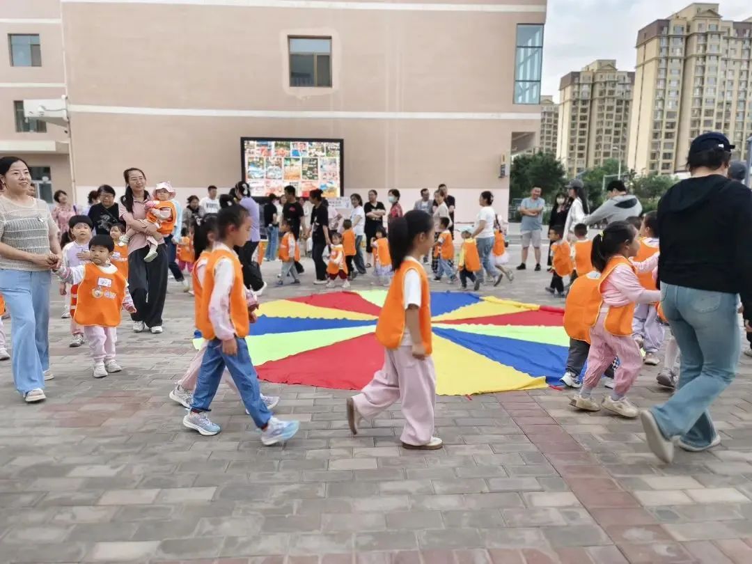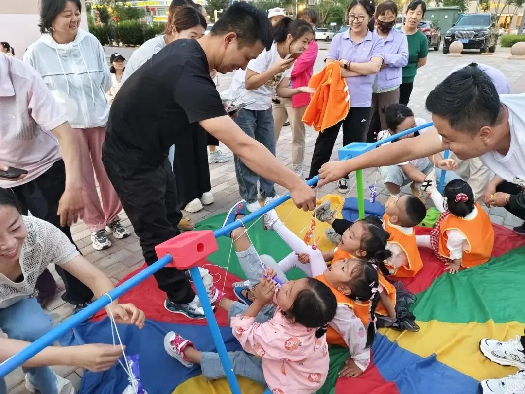 最受欢迎的环节当属“彩虹伞快乐游走”与“欢乐游戏互动”。巨大的彩虹伞在亲子合力下起伏翻涌,孩子们在色彩斑斓的伞下奔跑嬉戏;而“抓尾巴”“小企鹅走路”“吃山楂棒”等游戏,则让亲子间默契尽显。家长们一改平日严肃形象,与孩子共同完成滑稽有趣的动作,现场气氛热烈非凡。